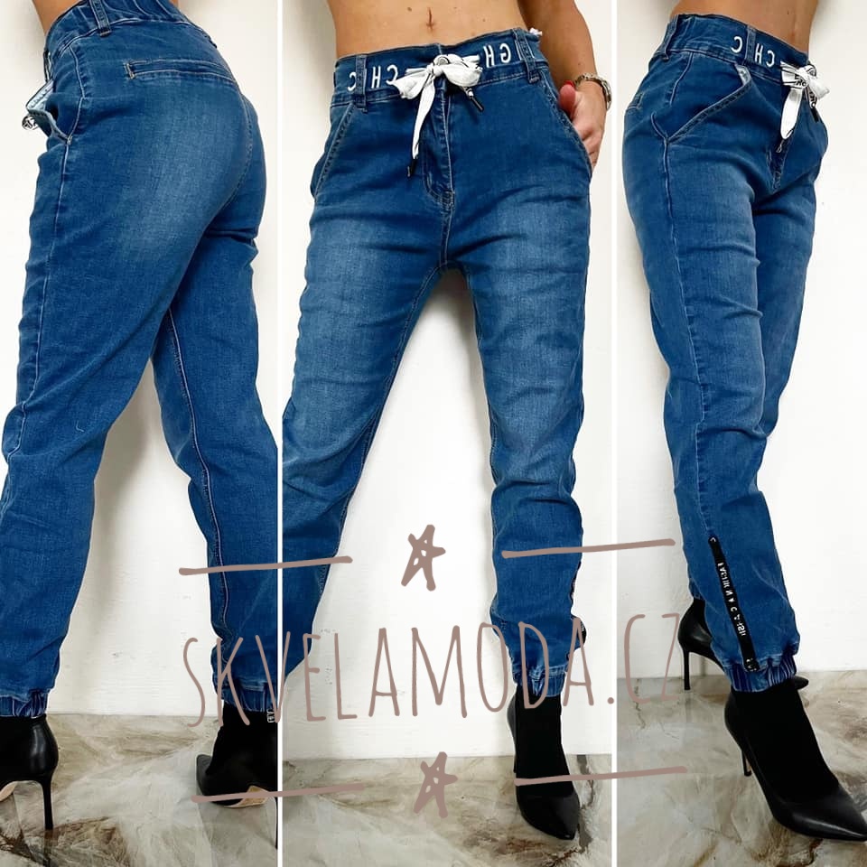 Suprové džíny s vyšitým nápisem HIGH CHIC v pase. Vzadu v pase všitá široká guma, šňůrka na stažení. Nohavice dole do gumy. Dole na nohavicích z boku našité černé pruhy s nápisem FASHION CLASIC. Vzadu falešné kapsy. Kalhoty jsou z pružného materiálu. V pase zip.