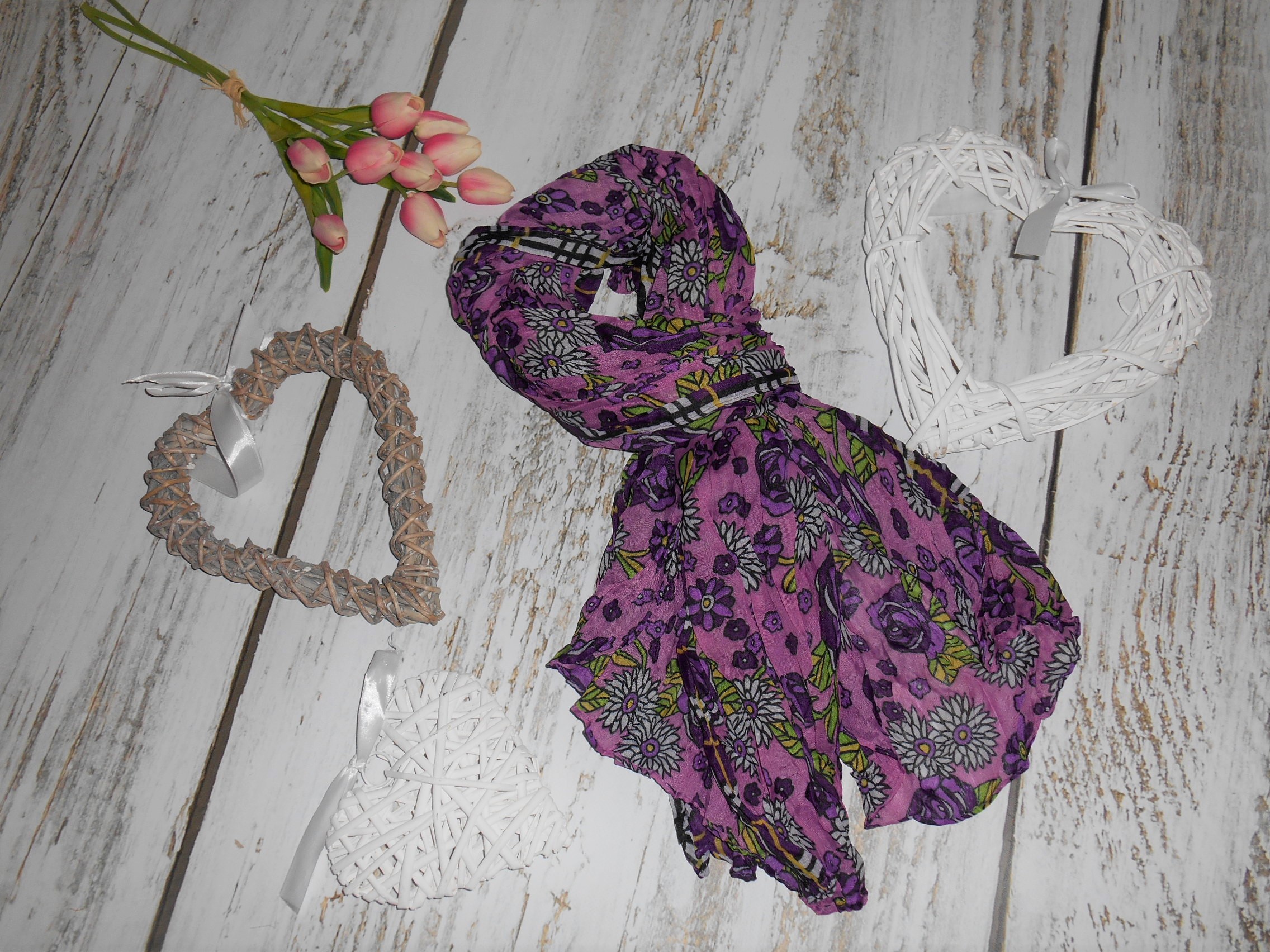 Módní šátek s květinovým potiskem, příjemný na dotek.
