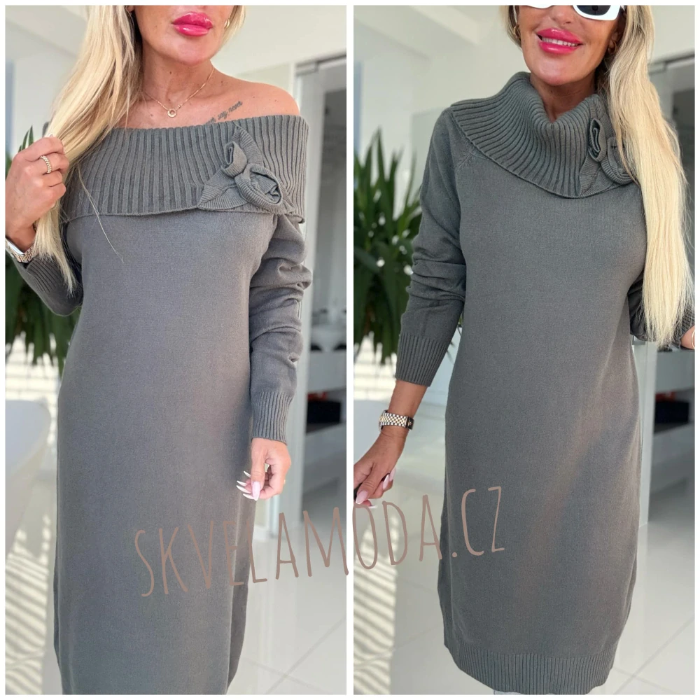 Kvalitní svetrové šaty s velkým rolákem, který je zdobený našitými květy. Rolák se dá stáhnout přes ramena.