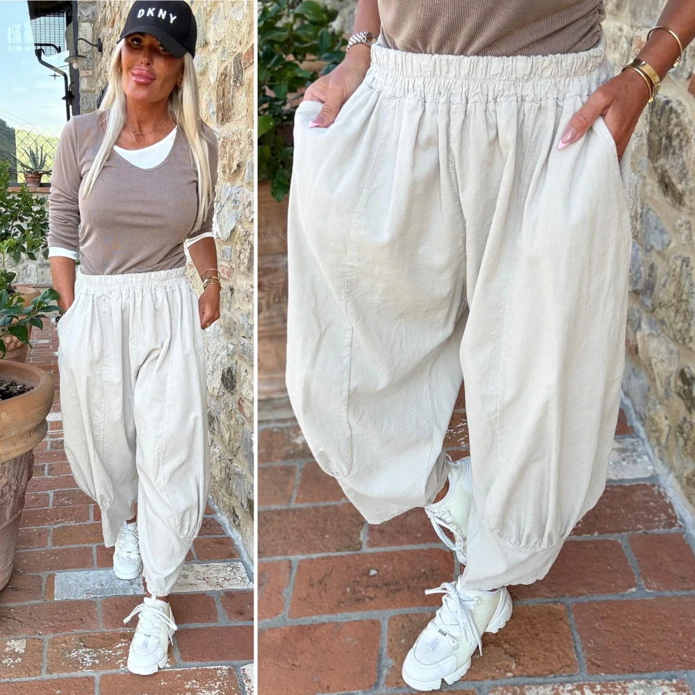 Kalhoty mají v pase prošitou gumu. Vepředu dvě kapsy. Vzadu bez kapes. Jsou z lehkého manžestru.