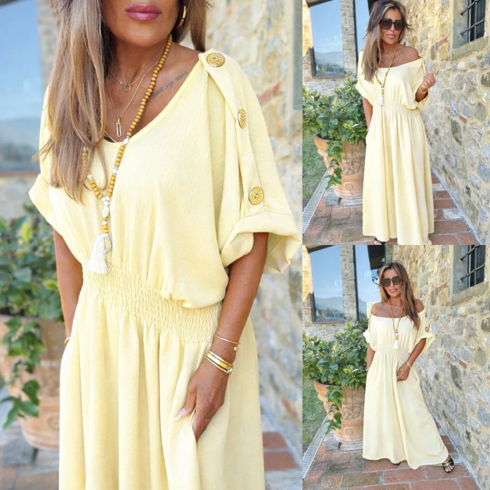 Šaty mají na ramenou zlaté knoflíčky. V pase žabičkování. Dvě boční kapsy. Vzhled materiálu - viz detailní foto.