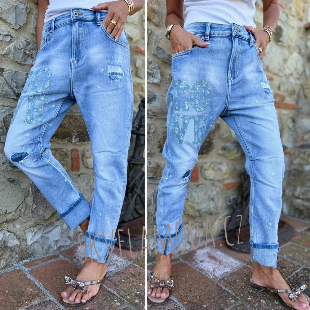 Džíny jsou pružné, trhané, na jedné nohavici mají našitý nápis LOVE zdobený flitry a kamínky. U velikosti S je navíc na druhé nohavici našité srdíčko s okem - viz foto. U velikosti L ani XL to není.