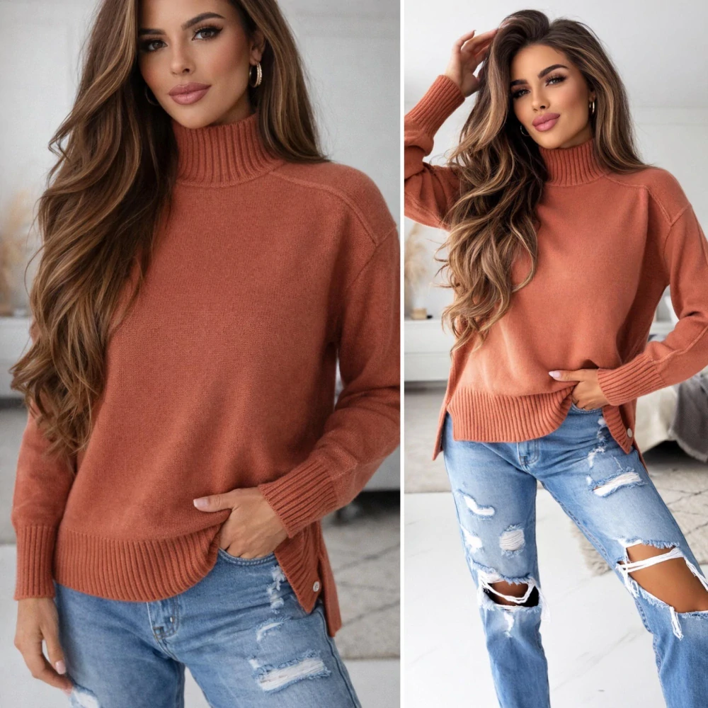 Svetřík je z příjemného materiálu. Dole po obou stranách rozparky. Vepředu kovové srdíčko. Pozor, u krku není stojáček jako na modelce. Výstřih - viz detailní foto.